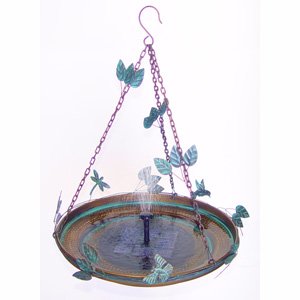Natures Foundry Large Bird Bath with Solar Mister has a removable chain so the bird bath can hang or be placed on a table or stand. The sound of moving water attracts birds more than seed. Moving water keeps your bird bath cleaner longer and helps prevent West Nile. Comes in Copper Bronze.